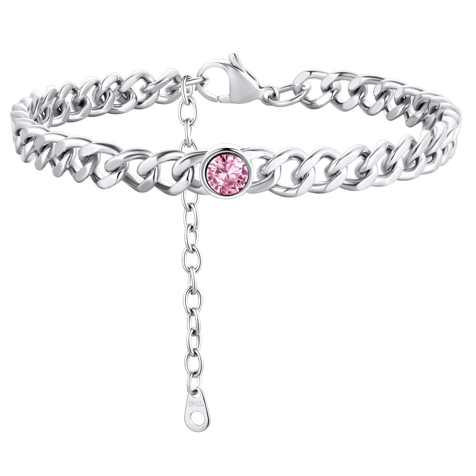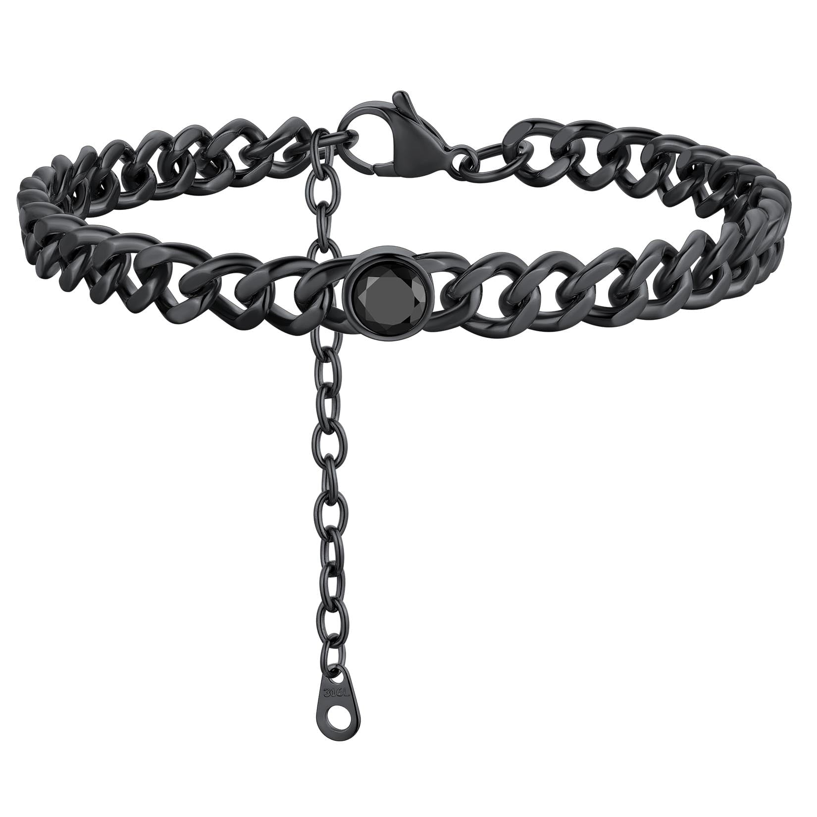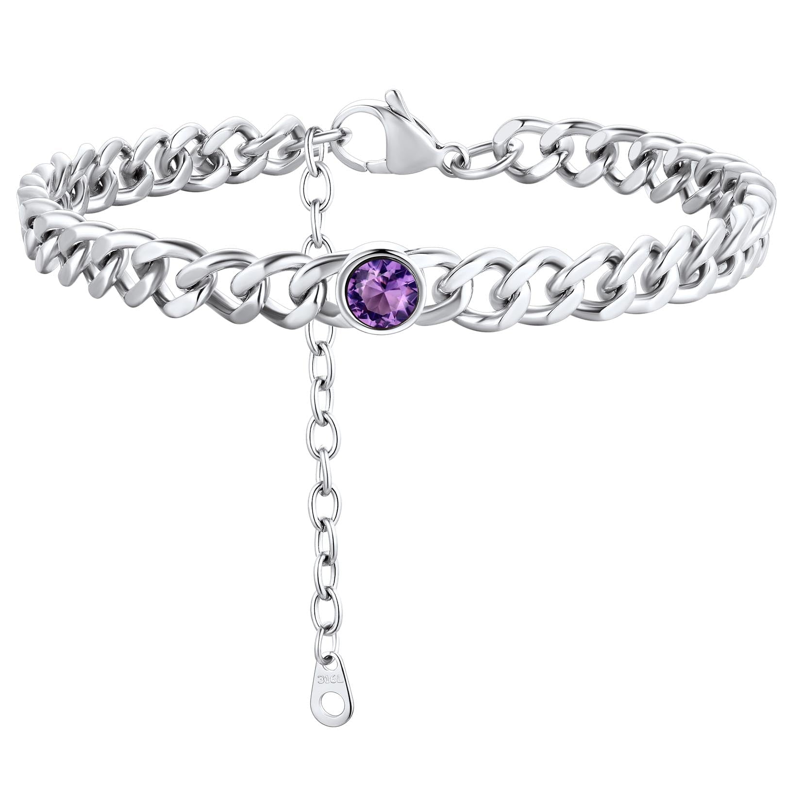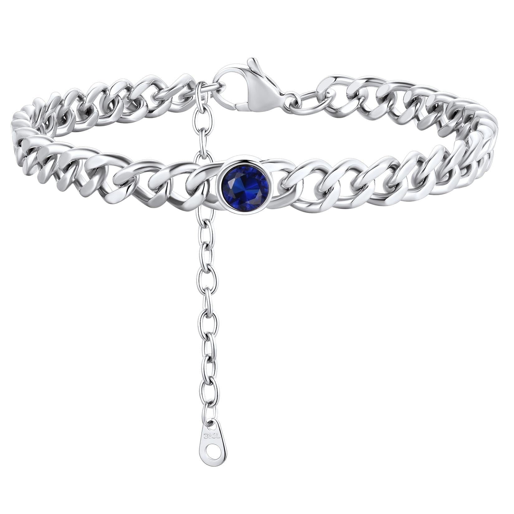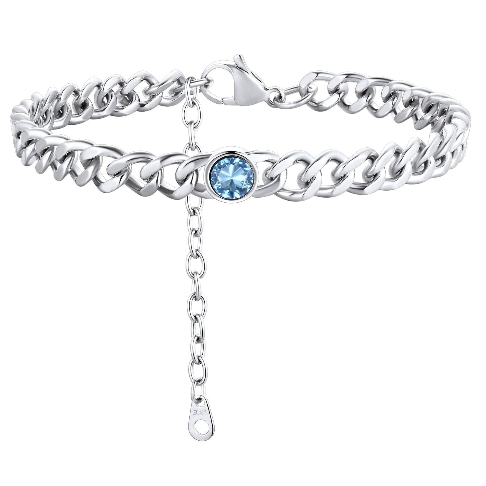 ANKLETS FOR MENS/WOMENS -- Crafted in 316L stainless steel. This mens/womens curb chain measures 7mm wide 8 inches length and available in your choice of 12 months birthstone. Includes a durable lobster clasp to ensure your chain stays secure at all times. It is designed and crafted to have the perfect weight, length, and shine, creating an men's accessory that can be worn with anything.