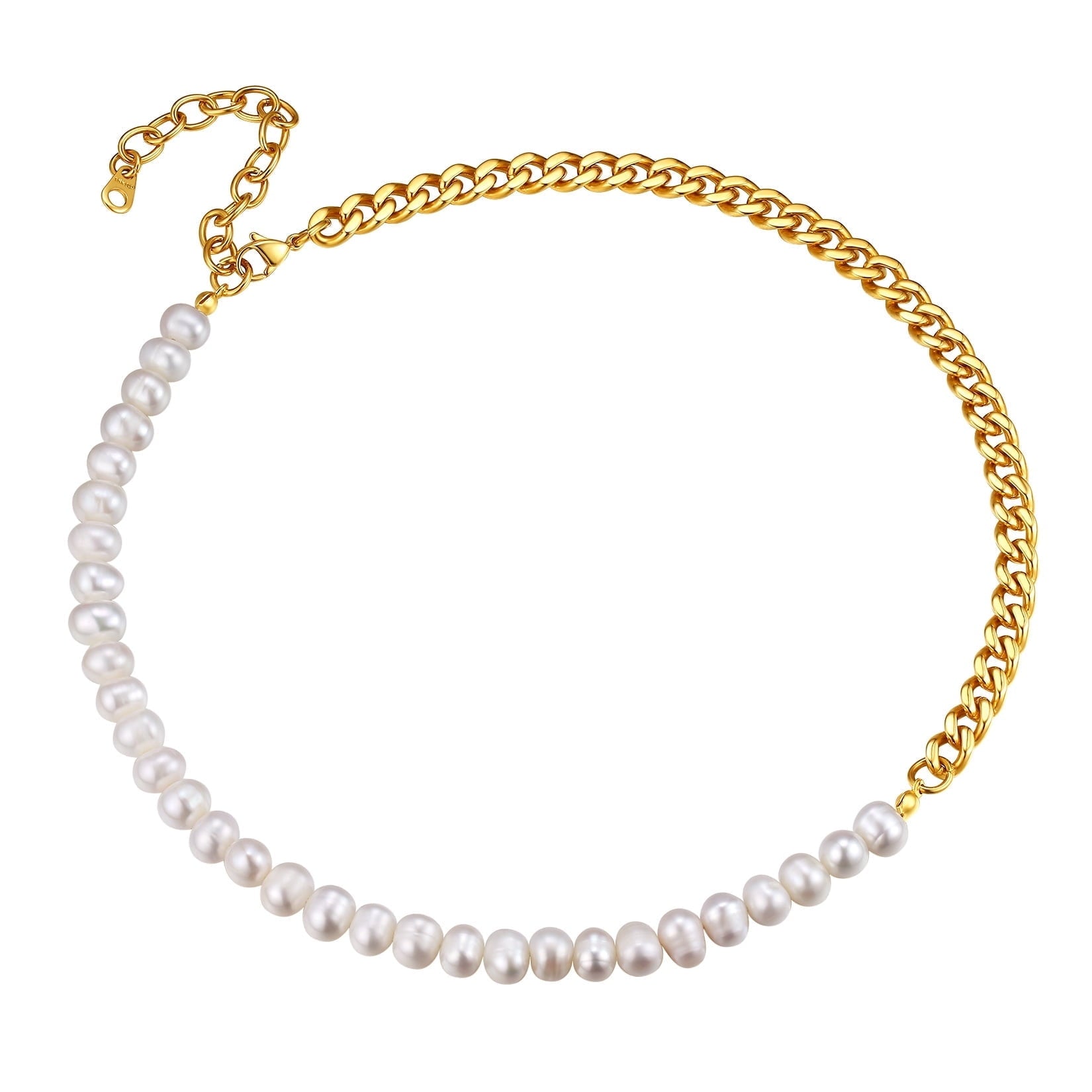 ChainsPro Pearl Choker Necklaces for Men Women Half Pearl Half Cuban Chain Necklace Stainless Steel/Gold Plated/Black